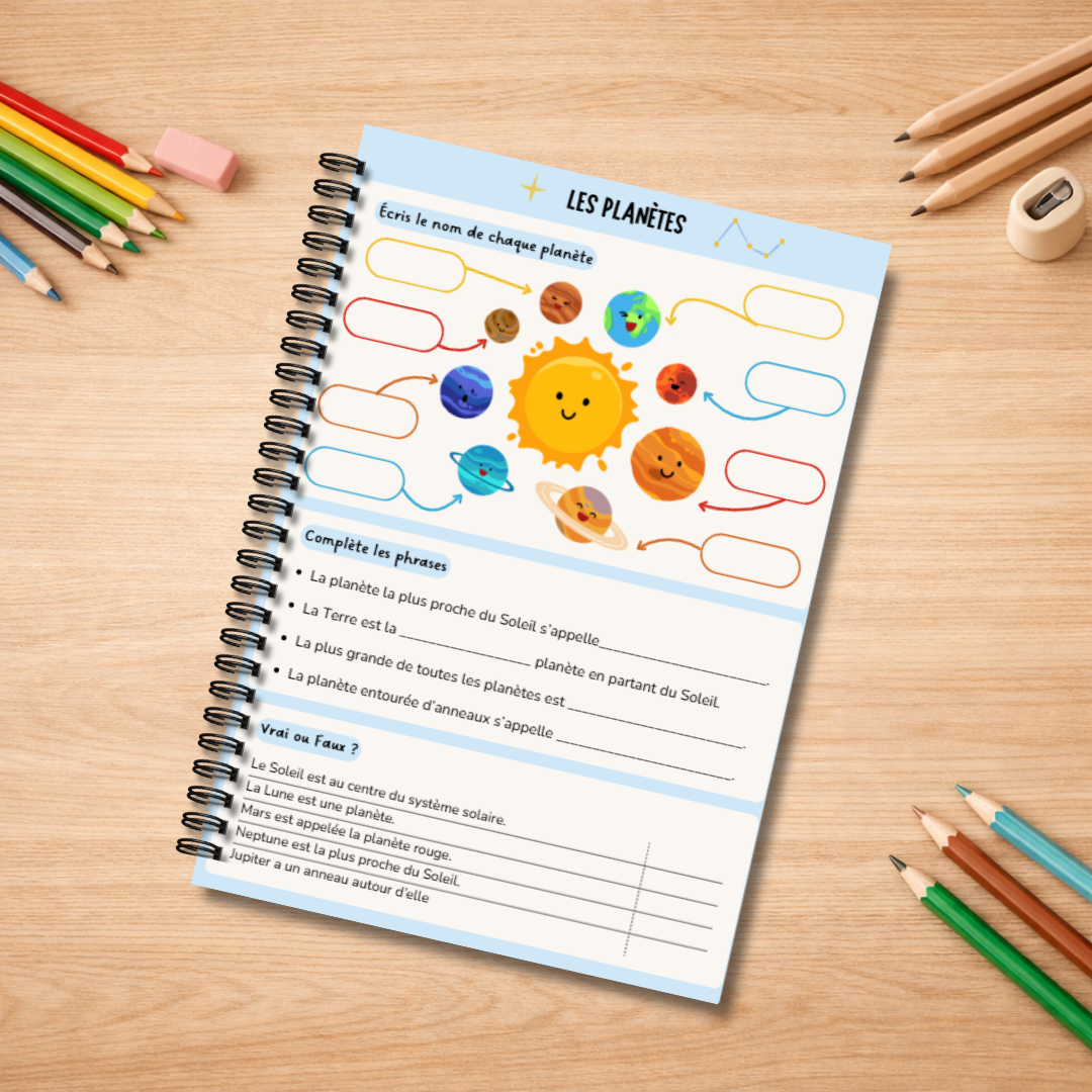 Un cahier imprimé et relié pour explorer l’univers tout en développant la réflexion. Pensé pour les enfants de 7 à 10 ans, ce cahier plonge l’enfant dans le thème de l’espace (planètes, fusées, étoiles…) pour apprendre en s’amusant et à son rythme.
