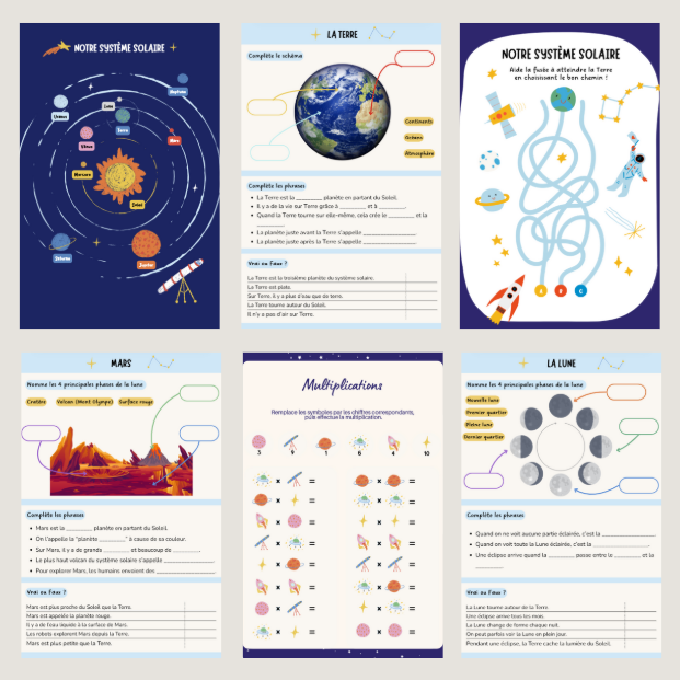 - 35 pages d’activités (les planètes du système solaire, la Terre et la Lune, les phases lunaires et les éclipses, les constellations et les étoiles, la vie des astronautes, les mystères de l'univers ...) + 1 diplôme à la finn