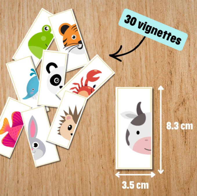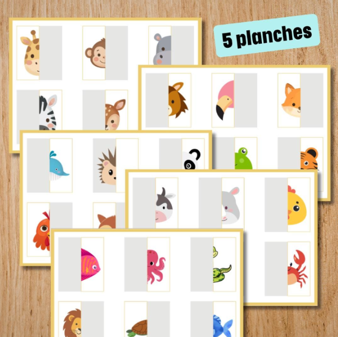 Ce pack propose un défi amusant pour les petits : retrouver et assembler les deux moitiés des visages d'animaux. Avec 5 planches colorées et 30 animaux différents au total, votre enfant développera son sens de l'observation et sa motricité fine.